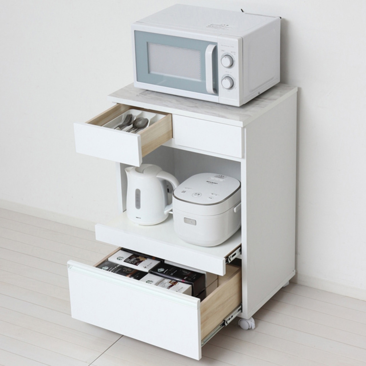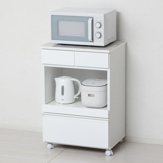 大理石のような美しいマーブル柄の天板を持つコンパクト レンジワゴン。耐熱性と耐水性に優れたメラミン材を使用しており、傷にも強いので長くご使用いただけます。お手入れも簡単で、忙しい毎日にぴったりのアイテムです。