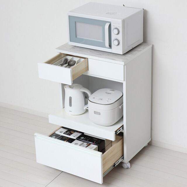 下部に大容量の引出しを備え、たっぷり収納できるのが魅力です。スライドレールを採用しており、奥の物でも簡単に取り出せる設計となっています。キッチンやリビングなどのスペースを有効活用し、整理整頓をサポートします。