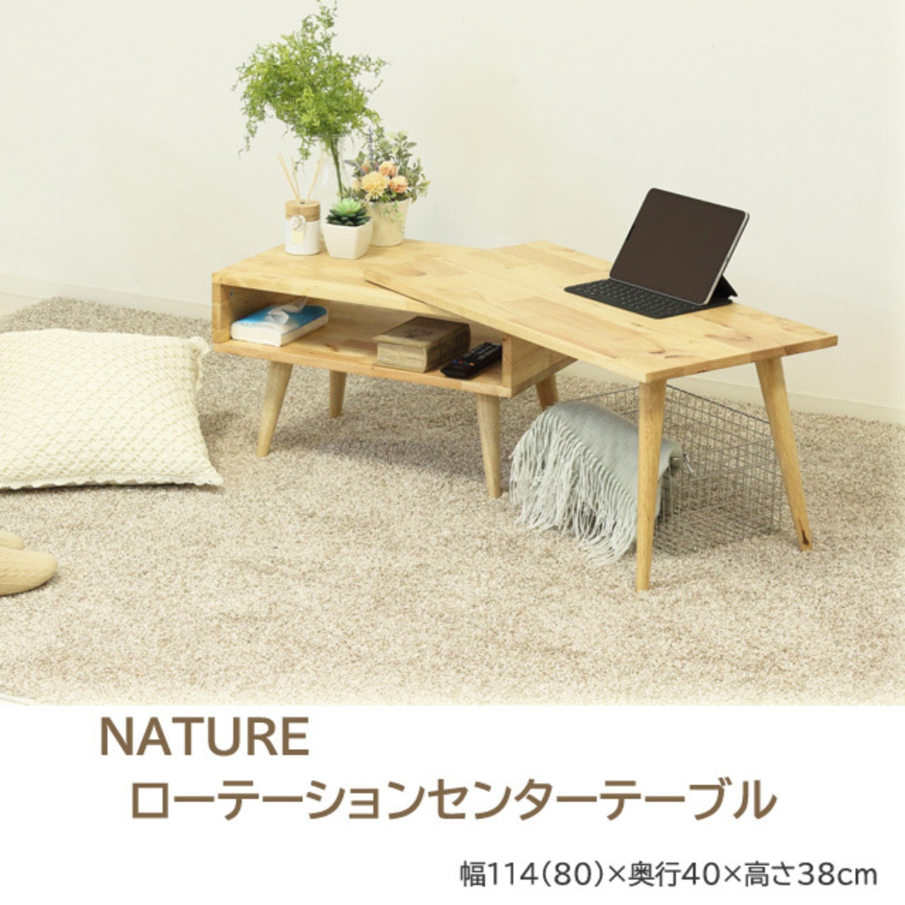 NATURE ローテーションセンターテーブルは、限りある資源を大切にした、SDGsに配慮した製品です。節や傷を丁寧にパテ埋めした木材を使用しているため、美しい仕上がりになっています。また、天然木の風合いをそのまま活かしたデザインは、部屋にやさしい雰囲気をもたらし、自然の温もりを感じられるアイテムです。