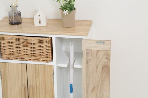 右扉収納部分には、背の高いブラシをしっかりと収納できる設計が施されており、柄の部分を気にせずに収納が可能です。この配慮が、日常使いでも快適さを提供します。また、傷や水に強いラッカー塗装仕様なので、安心して長くご使用いただけます。